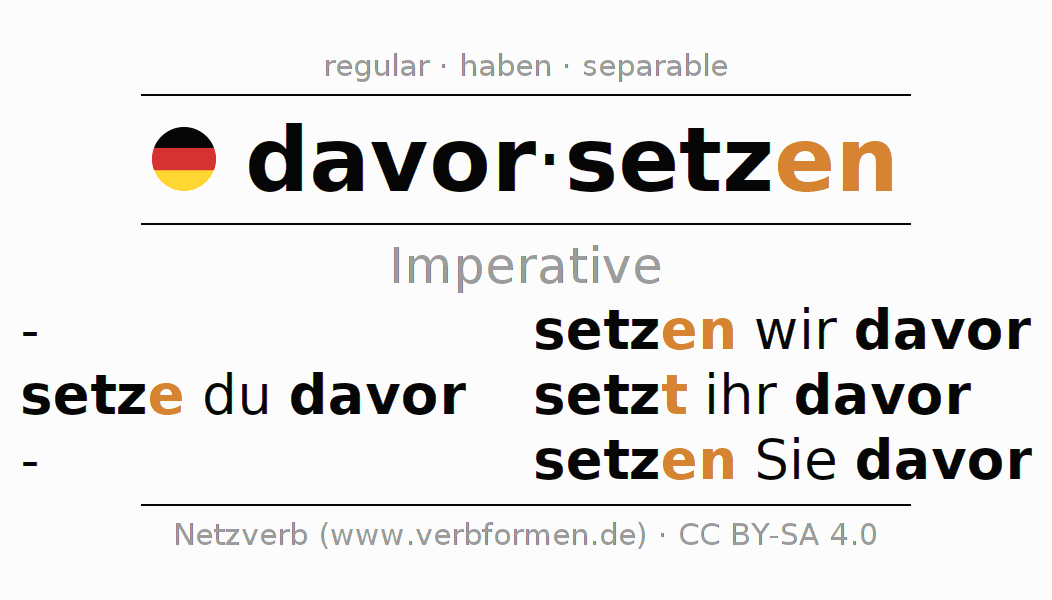 The conjugation of davorsetzen in Imperative Present Imperative Active is setze (du) davor, setzen wir davor, setzt (ihr) davor, setzen Sie davor.The conjugation corresponds to certain grammatical rules. Likewise the requirements for the conjugation of the simple verb forms of davorsetzen in Imperative. Comments ☆