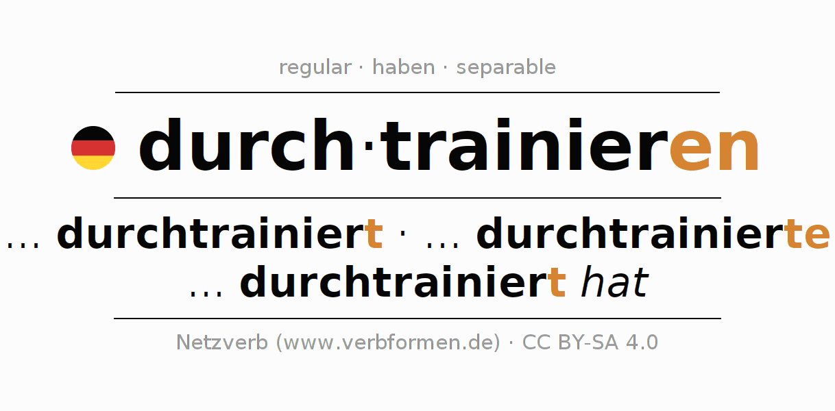 The conjugation of durchtrainieren in Imperative Present Imperative Active is trainiere (du) durch, trainieren wir durch, trainiert (ihr) durch, trainieren Sie durch.The conjugation corresponds to certain grammatical rules. Likewise the requirements for the conjugation of the simple verb forms of durchtrainieren in Imperative. Comments ☆