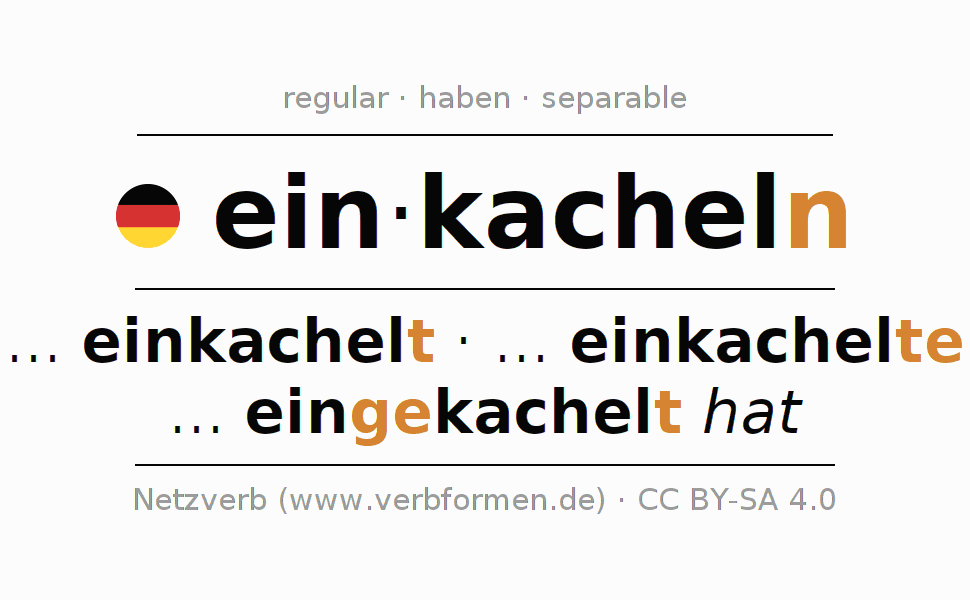 The conjugation of einkacheln in Imperative Present Imperative Active is kach(e)le (du) ein, kacheln wir ein, kachelt (ihr) ein, kacheln Sie ein.The conjugation corresponds to certain grammatical rules. Likewise the requirements for the conjugation of the simple verb forms of einkacheln in Imperative. Comments ☆