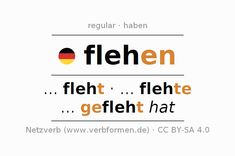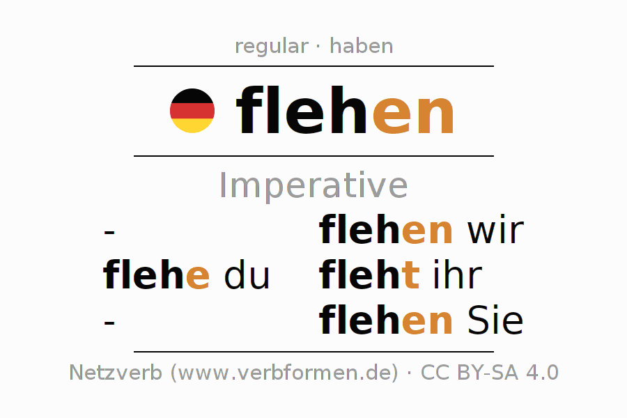 The conjugation of flehen in Imperative Present Imperative Active is flehe (du), flehen wir, fleht (ihr), flehen Sie.The conjugation corresponds to certain grammatical rules. Likewise the requirements for the conjugation of the simple verb forms of flehen in Imperative. Comments ☆