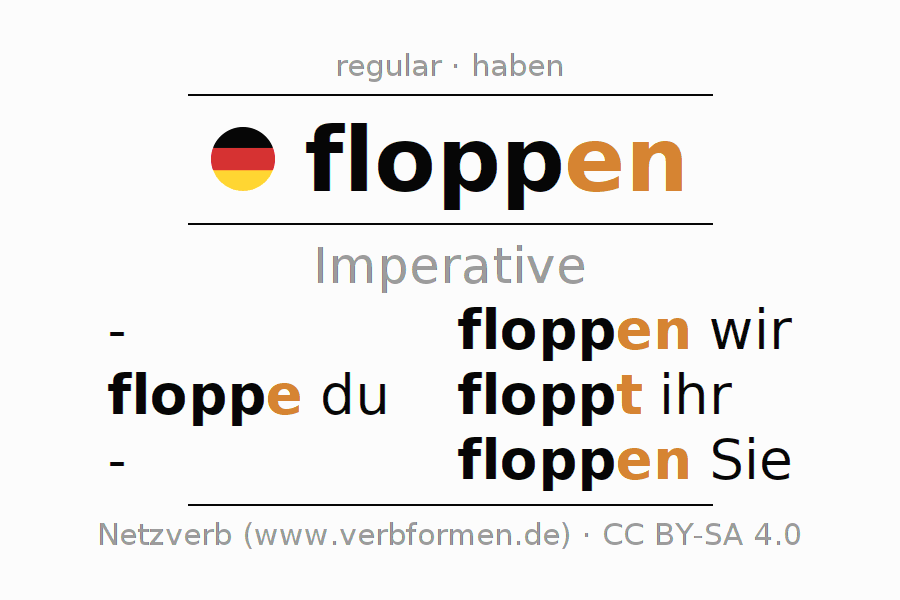 The conjugation of floppen in Imperative Present Imperative Active is floppe (du), floppen wir, floppt (ihr), floppen Sie.The conjugation corresponds to certain grammatical rules. Likewise the requirements for the conjugation of the simple verb forms of floppen in Imperative. Comments ☆