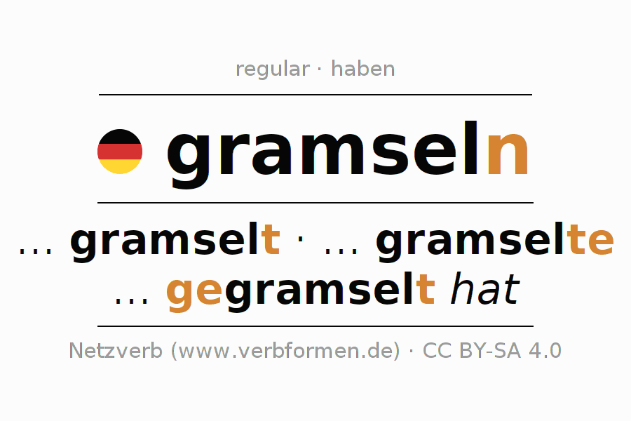 The conjugation of gramseln in Imperative Present Imperative Active is grams(e)le (du), gramseln wir, gramselt (ihr), gramseln Sie.The conjugation corresponds to certain grammatical rules. Likewise the requirements for the conjugation of the simple verb forms of gramseln in Imperative. Comments ☆