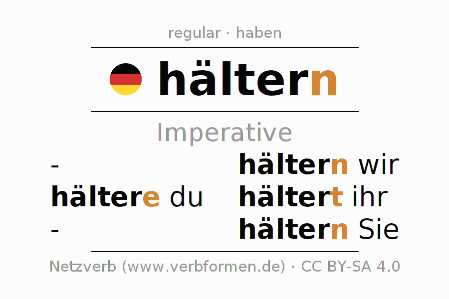 The conjugation of hältern in Imperative Present Imperative Active is hält(e)re (du), hältern wir, hältert (ihr), hältern Sie.The conjugation corresponds to certain grammatical rules. Likewise the requirements for the conjugation of the simple verb forms of hältern in Imperative. Comments ☆