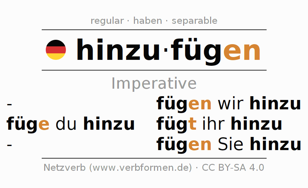 The conjugation of hinzufügen in Imperative Present Imperative Active is füge (du) hinzu, fügen wir hinzu, fügt (ihr) hinzu, fügen Sie hinzu.The conjugation corresponds to certain grammatical rules. Likewise the requirements for the conjugation of the simple verb forms of hinzufügen in Imperative. Comments ☆
