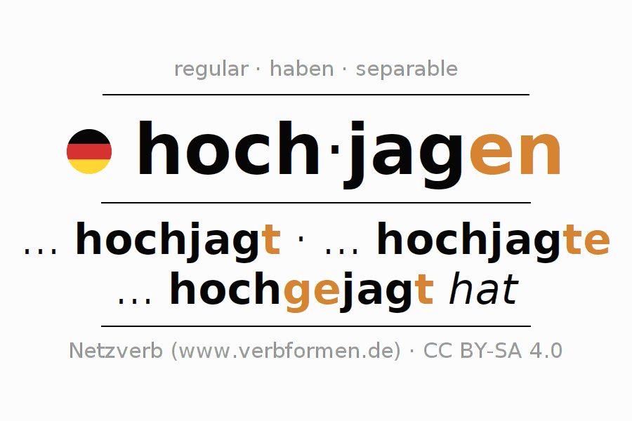 The conjugation of hochjagen in Imperative Present Imperative Active is jage (du) hoch, jagen wir hoch, jagt (ihr) hoch, jagen Sie hoch.The conjugation corresponds to certain grammatical rules. Likewise the requirements for the conjugation of the simple verb forms of hochjagen in Imperative. Comments ☆