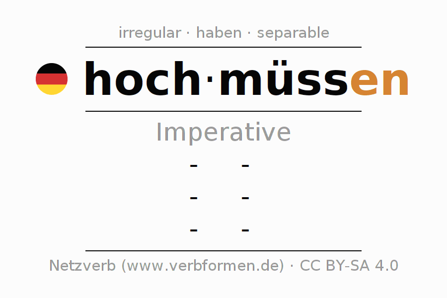 The verb hochmüssen fully conjugated in all persons and numbers in the Imperative Present