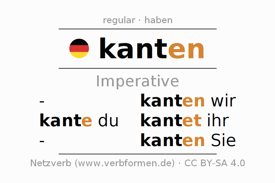 The conjugation of kanten in Imperative Present Imperative Active is kante (du), kanten wir, kantet (ihr), kanten Sie.The conjugation corresponds to certain grammatical rules. Likewise the requirements for the conjugation of the simple verb forms of kanten in Imperative. Comments ☆