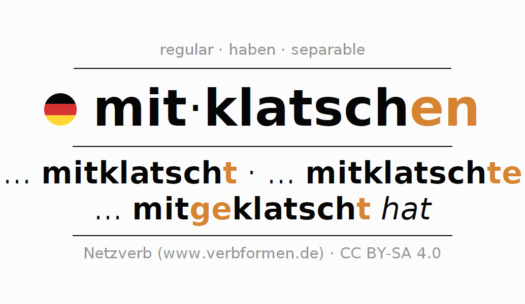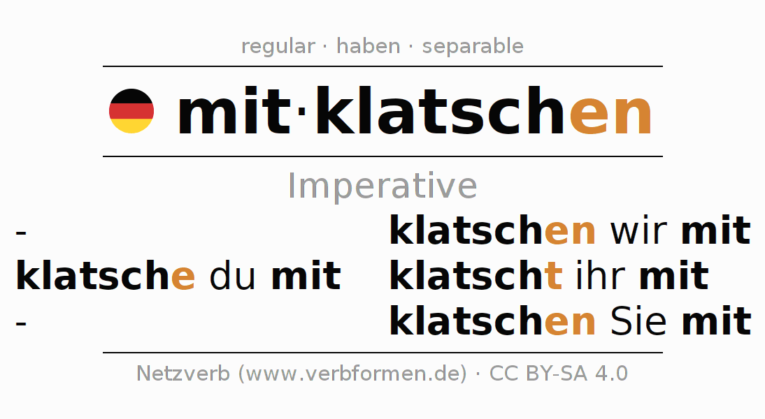 The conjugation of mitklatschen in Imperative Present Imperative Active is klatsche (du) mit, klatschen wir mit, klatscht (ihr) mit, klatschen Sie mit.The conjugation corresponds to certain grammatical rules. Likewise the requirements for the conjugation of the simple verb forms of mitklatschen in Imperative. Comments ☆