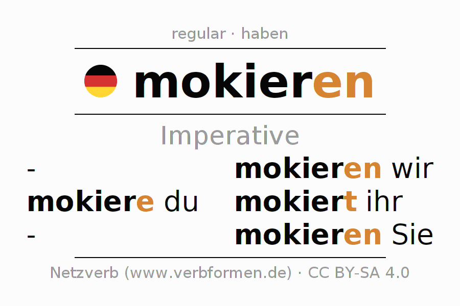 The conjugation of mokieren in Imperative Present Imperative Active is mokiere (du), mokieren wir, mokiert (ihr), mokieren Sie.The conjugation corresponds to certain grammatical rules. Likewise the requirements for the conjugation of the simple verb forms of mokieren in Imperative. Comments ☆
