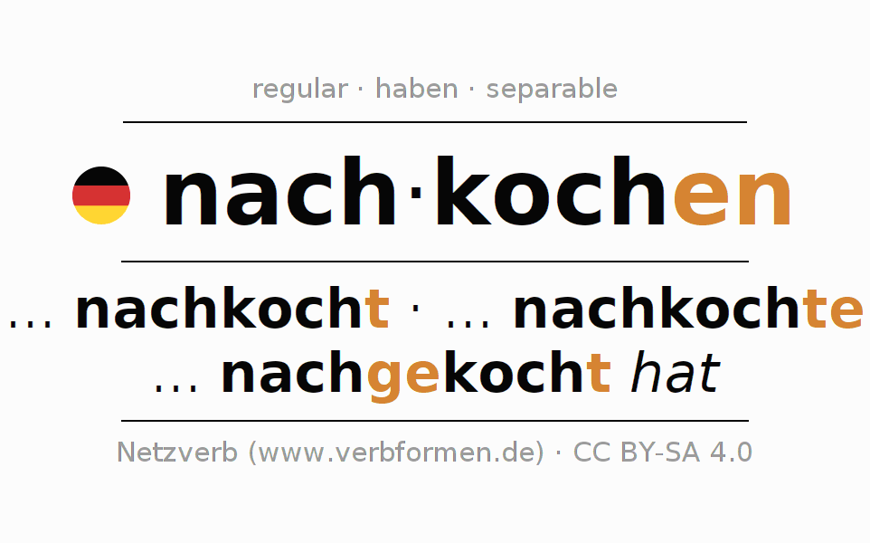The conjugation of nachkochen in Imperative Present Imperative Active is koche (du) nach, kochen wir nach, kocht (ihr) nach, kochen Sie nach.The conjugation corresponds to certain grammatical rules. Likewise the requirements for the conjugation of the simple verb forms of nachkochen in Imperative. Comments ☆