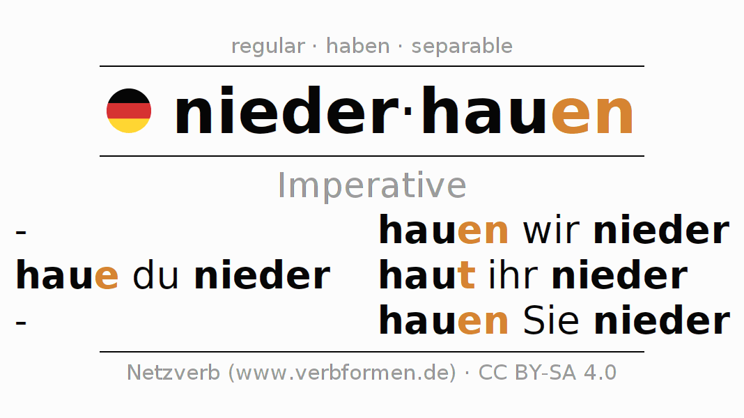 The verb niederhauen fully conjugated in all persons and numbers in the Imperative Present