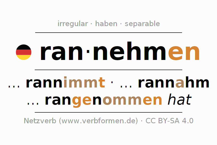 The conjugation of rannehmen in Imperative Present Imperative Active is nimm (du) ran, nehmen wir ran, nehmt (ihr) ran, nehmen Sie ran.The conjugation corresponds to certain grammatical rules. Likewise the requirements for the conjugation of the simple verb forms of rannehmen in Imperative. Comments ☆