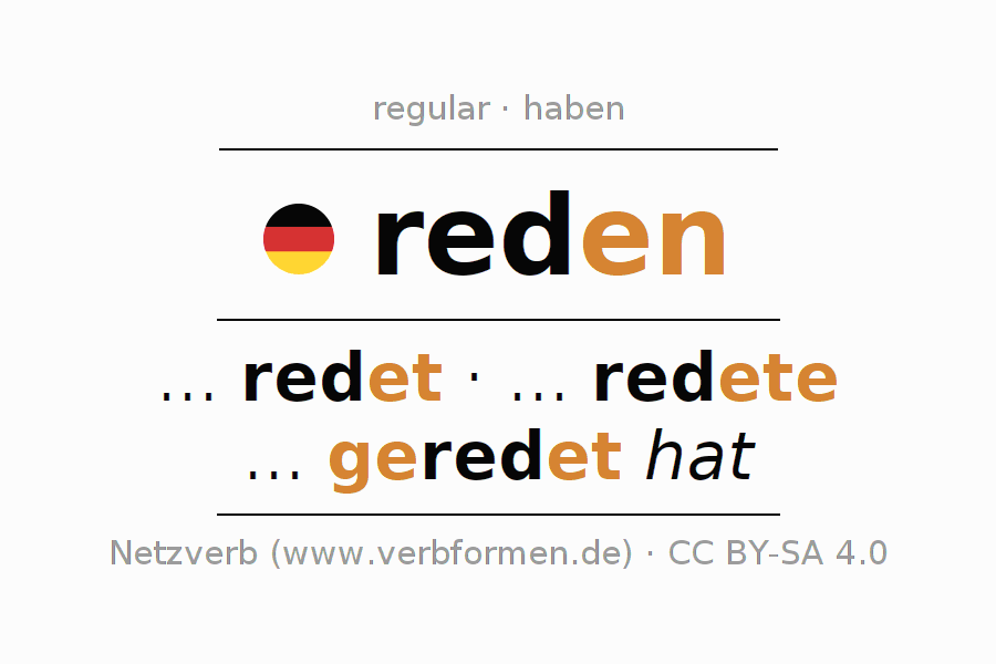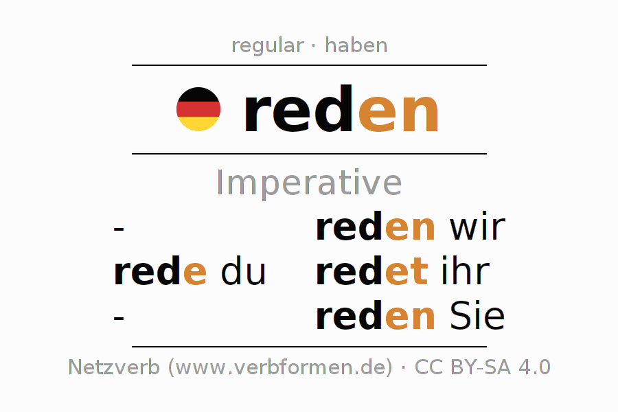 The conjugation of reden in Imperative Present Imperative Active is rede (du), reden wir, redet (ihr), reden Sie.The conjugation corresponds to certain grammatical rules. Likewise the requirements for the conjugation of the simple verb forms of reden in Imperative. Comments ☆