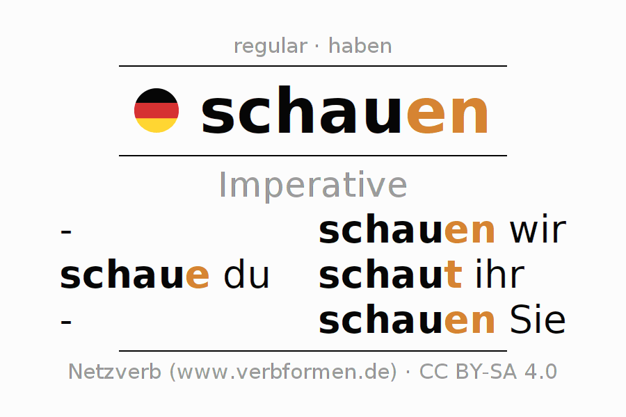 The conjugation of schauen in Imperative Present Imperative Active is schaue (du), schauen wir, schaut (ihr), schauen Sie.The conjugation corresponds to certain grammatical rules. Likewise the requirements for the conjugation of the simple verb forms of schauen in Imperative. Comments ☆