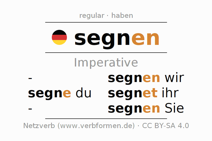 The verb segnen fully conjugated in all persons and numbers in the Imperative Present