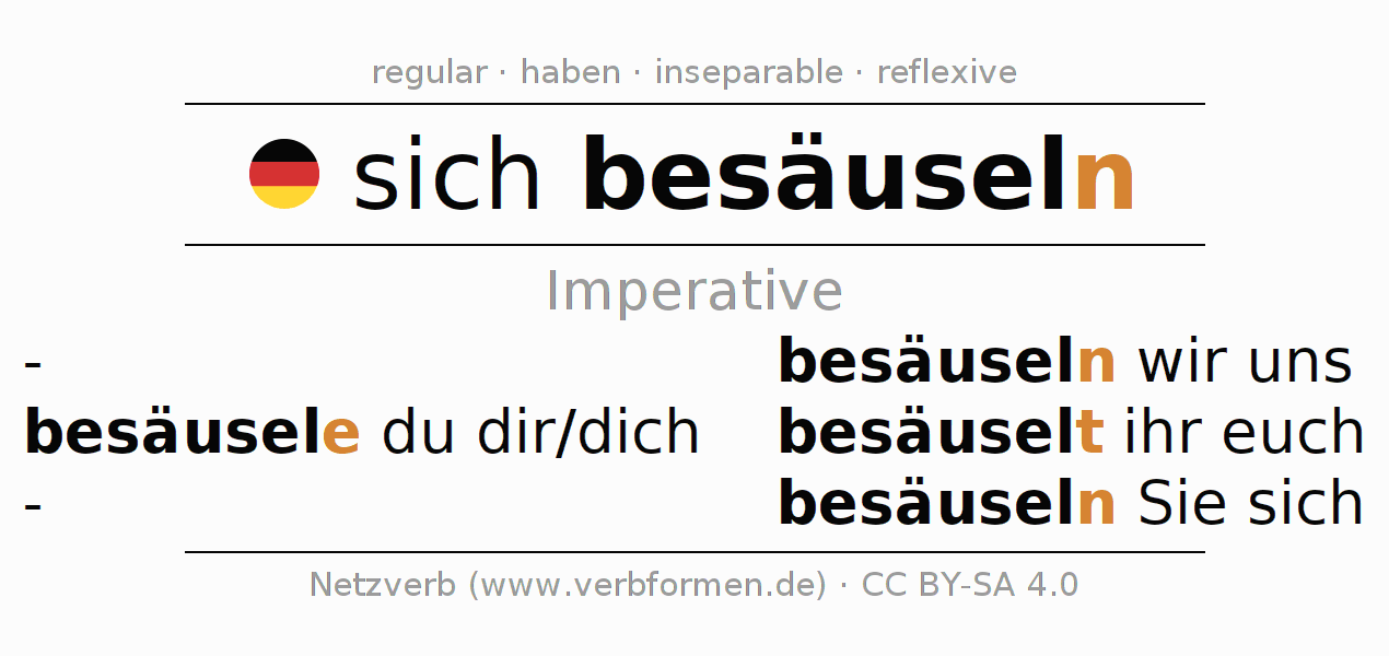 The verb sich besäuseln fully conjugated in all persons and numbers in the Imperative Present