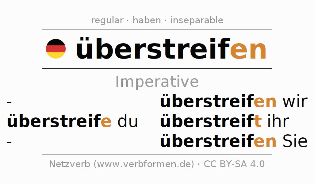 The conjugation of überstreifen in Imperative Present Imperative Active is überstreife (du), überstreifen wir, überstreift (ihr), überstreifen Sie.The conjugation corresponds to certain grammatical rules. Likewise the requirements for the conjugation of the simple verb forms of überstreifen in Imperative. Comments ☆