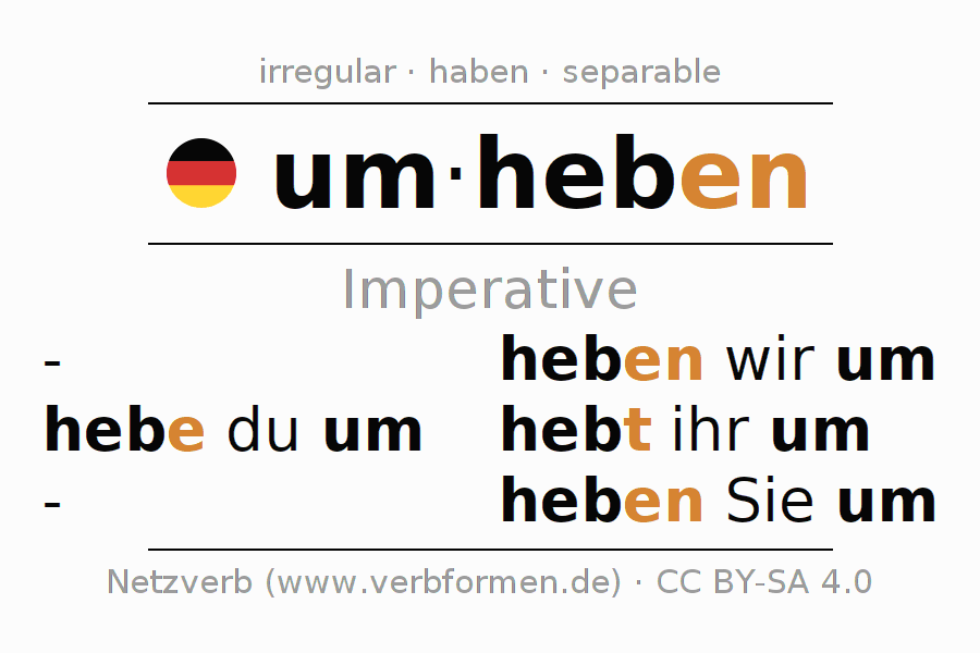 The conjugation of umheben in Imperative Present Imperative Active is hebe (du) um, heben wir um, hebt (ihr) um, heben Sie um.The conjugation corresponds to certain grammatical rules. Likewise the requirements for the conjugation of the simple verb forms of umheben in Imperative. Comments ☆