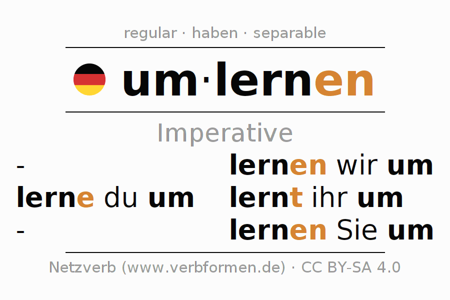 The conjugation of umlernen in Imperative Present Imperative Active is lerne (du) um, lernen wir um, lernt (ihr) um, lernen Sie um.The conjugation corresponds to certain grammatical rules. Likewise the requirements for the conjugation of the simple verb forms of umlernen in Imperative. Comments ☆