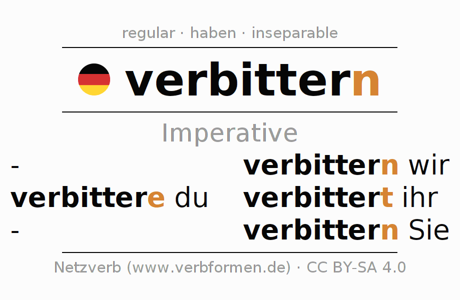 The verb verbittern (hat) fully conjugated in all persons and numbers in the Imperative Present