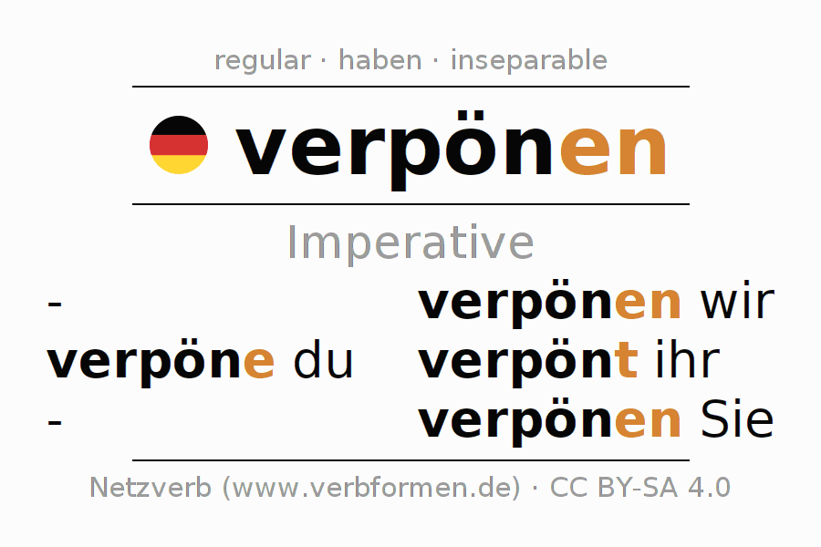 The conjugation of verpönen in Imperative Present Imperative Active is verpöne (du), verpönen wir, verpönt (ihr), verpönen Sie.The conjugation corresponds to certain grammatical rules. Likewise the requirements for the conjugation of the simple verb forms of verpönen in Imperative. Comments ☆