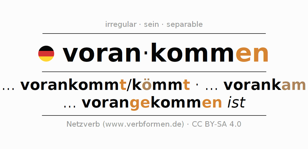 The conjugation of vorankommen in Imperative Present Imperative Active is komme (du) voran, kommen wir voran, kommt (ihr) voran, kommen Sie voran.The conjugation corresponds to certain grammatical rules. Likewise the requirements for the conjugation of the simple verb forms of vorankommen in Imperative. Comments ☆