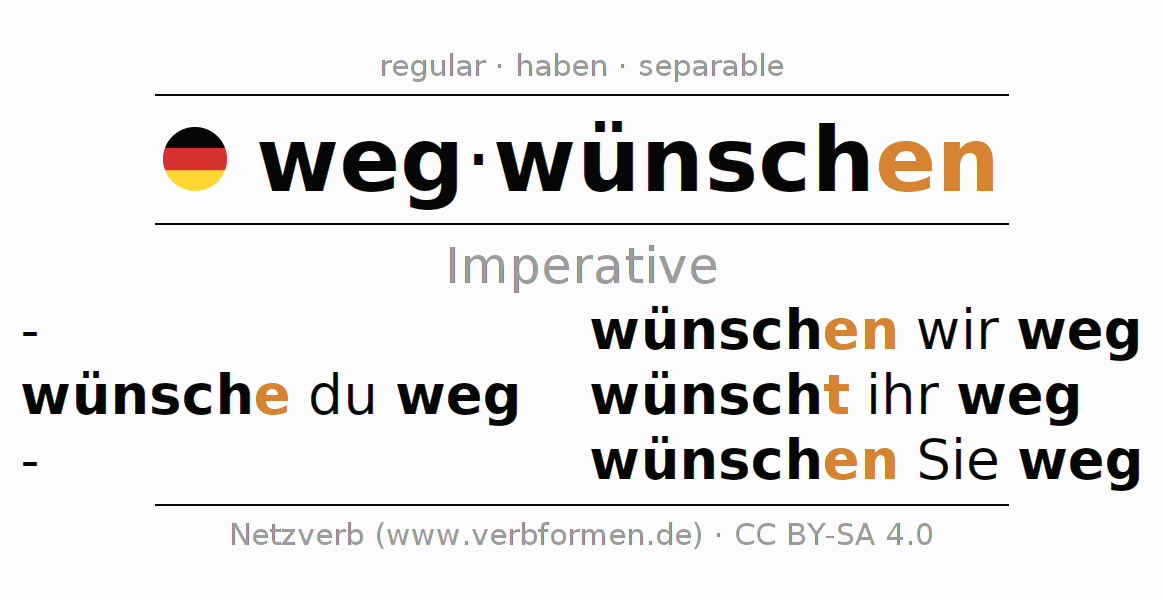 The conjugation of wegwünschen in Imperative Present Imperative Active is wünsche (du) weg, wünschen wir weg, wünscht (ihr) weg, wünschen Sie weg.The conjugation corresponds to certain grammatical rules. Likewise the requirements for the conjugation of the simple verb forms of wegwünschen in Imperative. Comments ☆