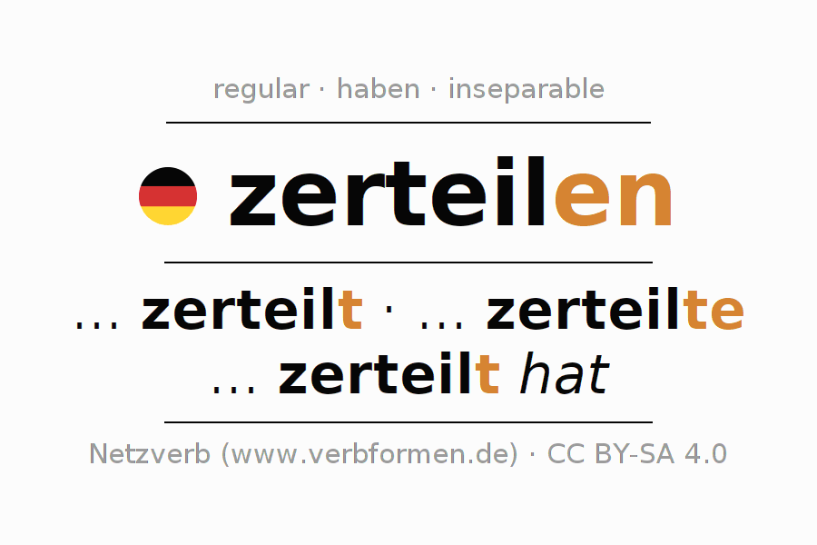 The conjugation of zerteilen in Imperative Present Imperative Active is zerteile (du), zerteilen wir, zerteilt (ihr), zerteilen Sie.The conjugation corresponds to certain grammatical rules. Likewise the requirements for the conjugation of the simple verb forms of zerteilen in Imperative. Comments ☆