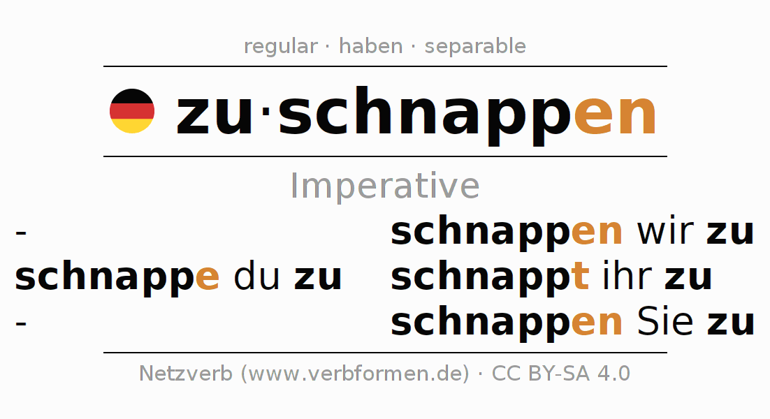 The verb zuschnappen (hat) fully conjugated in all persons and numbers in the Imperative Present