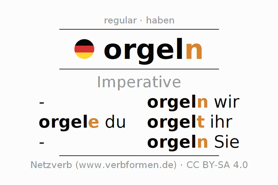 The verb orgeln fully conjugated in all persons and numbers in the Imperative Present