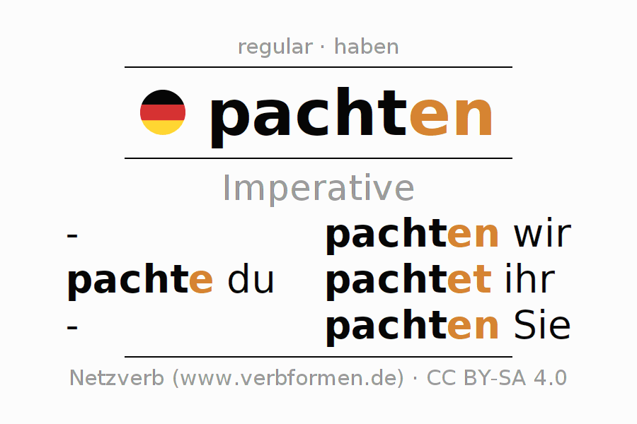 The conjugation of pachten (lease, rent) in the imperative is: pachte (du), pachten wir, pachtet (ihr), pachten Sie. The imperative is formed with the stem of present tense pacht. The endings -e, -en, -et, -en are appended to the stem. The ending of the 2nd Person Singular is extended by an e, as the stem ends in t. The personal pronoun is usually omitted in the 2nd person singular.The formation of the forms corresponds to the grammatical rules for the conjugation of the verbs in imperative. Comments ☆