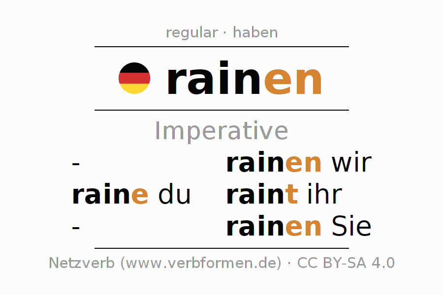 The verb rainen fully conjugated in all persons and numbers in the Imperative Present