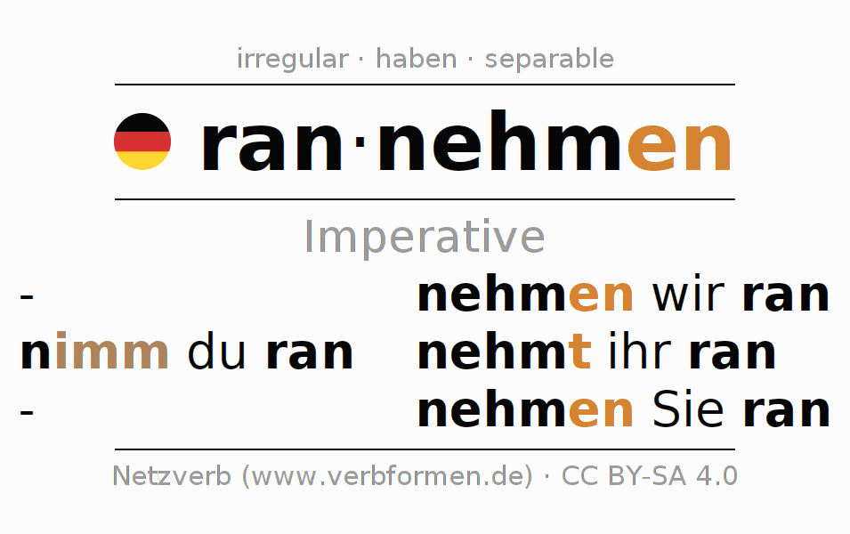 The conjugation of rannehmen (take on, accept) in the imperative is: nimm (du) ran, nehmen wir ran, nehmt (ihr) ran, nehmen Sie ran. The imperative is formed with the stem of present tense nehm. As an irregular verb there is the changed stem nimm in the second person singular. The endings -, -en, -t, -en are appended to the stem. The ending of the 2nd person singular has been shortened by one e, as the stem ends on m. The prefix ran- of rannehmen is separated.The personal pronoun is usually omitted in the 2nd person singular.The formation of the forms corresponds to the grammatical rules for the conjugation of the verbs in imperative. Comments ☆