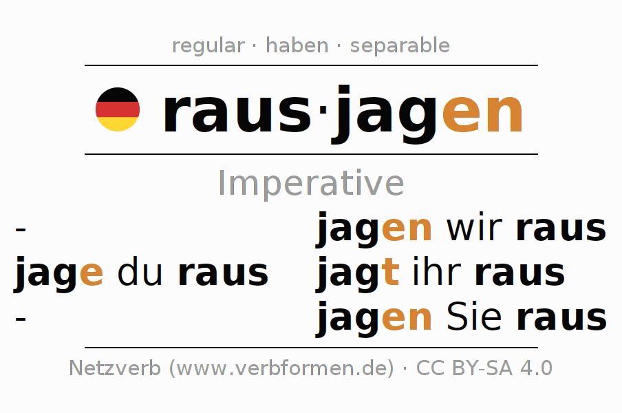 The conjugation of rausjagen (chase out, drive out) in the imperative is: jage (du) raus, jagen wir raus, jagt (ihr) raus, jagen Sie raus. The imperative is formed with the stem of present tense jag. The endings -e, -en, -t, -en are appended to the stem. The prefix raus- of rausjagen is separated.The personal pronoun is usually omitted in the 2nd person singular.The formation of the forms corresponds to the grammatical rules for the conjugation of the verbs in imperative. Comments ☆