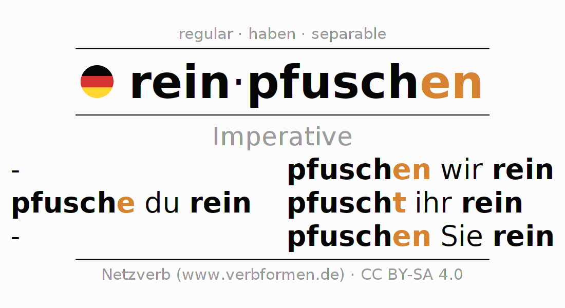 The conjugation of reinpfuschen (interfere, meddle) in the imperative is: pfusche (du) rein, pfuschen wir rein, pfuscht (ihr) rein, pfuschen Sie rein. The imperative is formed with the stem of present tense pfusch. The endings -e, -en, -t, -en are appended to the stem. The prefix rein- of reinpfuschen is separated.The personal pronoun is usually omitted in the 2nd person singular.The formation of the forms corresponds to the grammatical rules for the conjugation of the verbs in imperative. Comments ☆