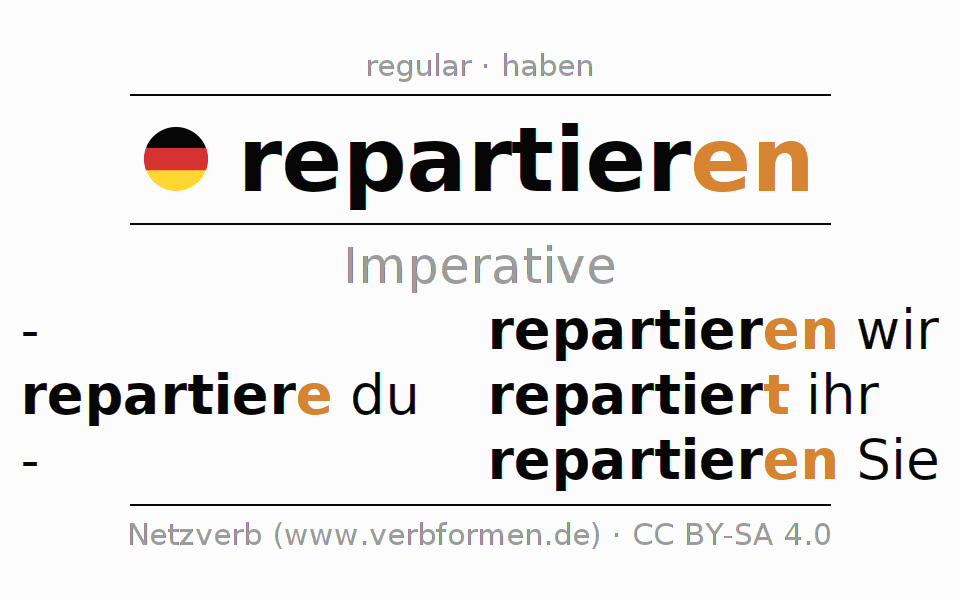 The conjugation of repartieren (apportion, allocate) in the imperative is: repartiere (du), repartieren wir, repartiert (ihr), repartieren Sie. The imperative is formed with the stem of present tense repartier. The endings -e, -en, -t, -en are appended to the stem. The personal pronoun is usually omitted in the 2nd person singular.The formation of the forms corresponds to the grammatical rules for the conjugation of the verbs in imperative. Comments ☆