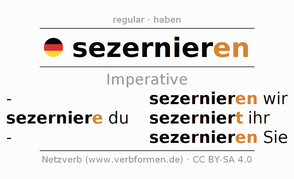 The conjugation of sezernieren (secrete, excrete) in the imperative is: sezerniere (du), sezernieren wir, sezerniert (ihr), sezernieren Sie. The imperative is formed with the stem of present tense sezernier. The endings -e, -en, -t, -en are appended to the stem. The personal pronoun is usually omitted in the 2nd person singular.The formation of the forms corresponds to the grammatical rules for the conjugation of the verbs in imperative. Comments ☆