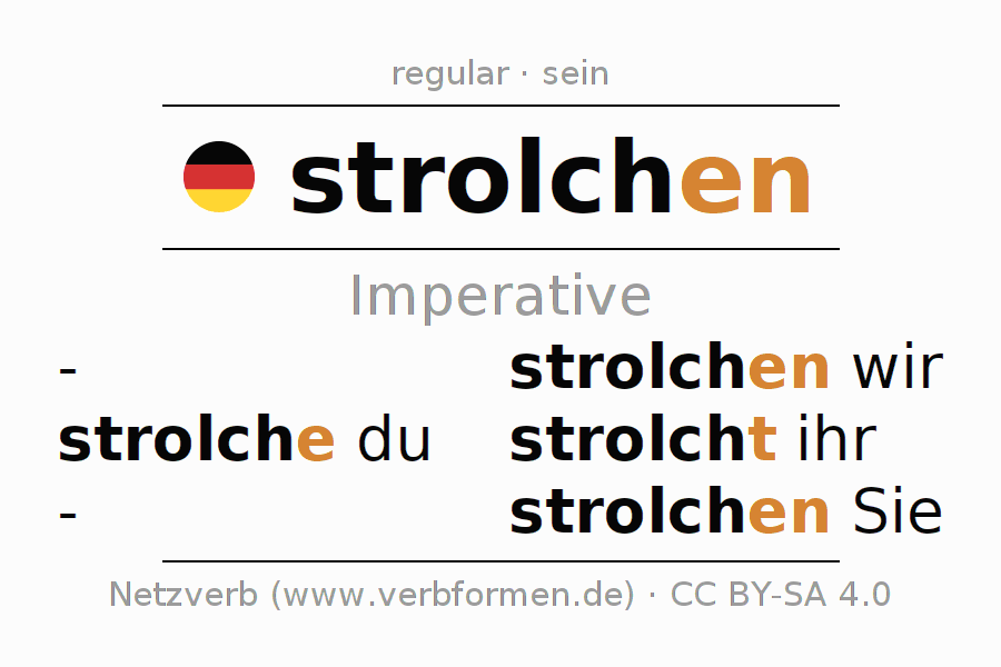 The conjugation of strolchen (roam, roam about) in the imperative is: strolche (du), strolchen wir, strolcht (ihr), strolchen Sie. The imperative is formed with the stem of present tense strolch. The endings -e, -en, -t, -en are appended to the stem. The personal pronoun is usually omitted in the 2nd person singular.The formation of the forms corresponds to the grammatical rules for the conjugation of the verbs in imperative. Comments ☆