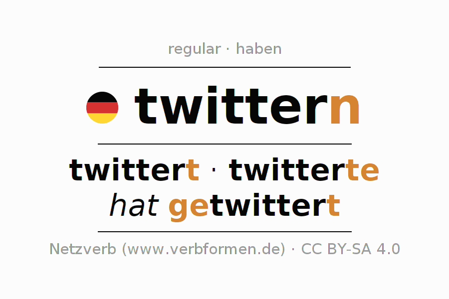 The conjugation of twittern (tweet, twitter) in the imperative is: twitt(e)re (du), twittern wir, twittert (ihr), twittern Sie. The imperative is formed with the stem of present tense twitter. The endings -e, -n, -t, -n are appended to the stem. The endings in the 1st and 3rd person plural are shortened by e, since the verb ends with -ern. The personal pronoun is usually omitted in the 2nd person singular.The formation of the forms corresponds to the grammatical rules for the conjugation of the verbs in imperative. Comments ☆