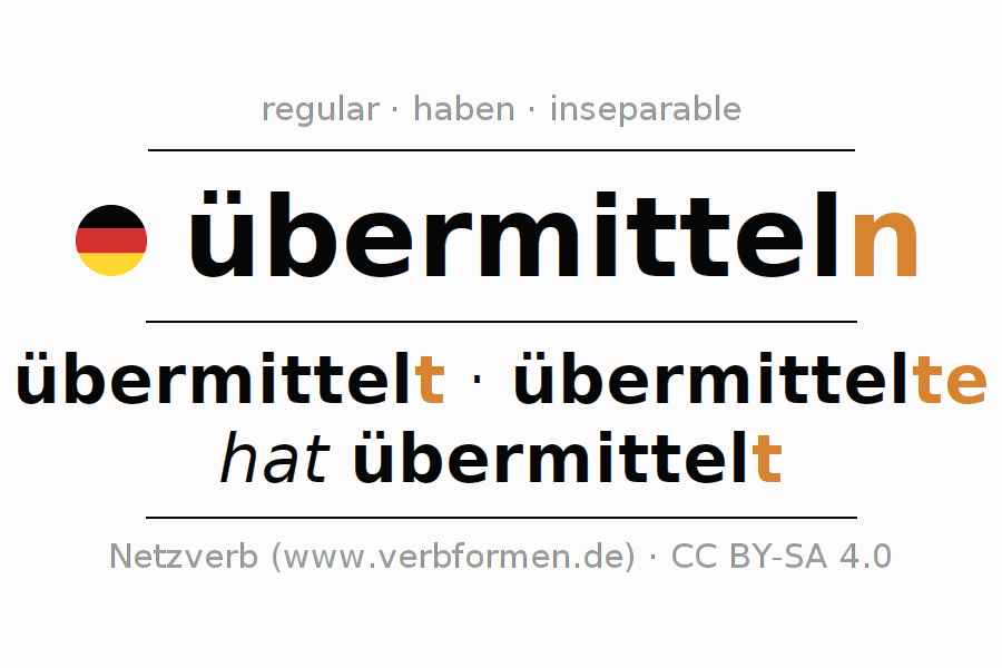 The conjugation of übermitteln (communicate, deliver) in the imperative is: übermitt(e)le (du), übermitteln wir, übermittelt (ihr), übermitteln Sie. The imperative is formed with the stem of present tense mittel. The endings -e, -n, -t, -n are appended to the stem. The endings in the 1st and 3rd person plural are shortened by e, since the verb ends with -ern. The personal pronoun is usually omitted in the 2nd person singular.The formation of the forms corresponds to the grammatical rules for the conjugation of the verbs in imperative. Comments ☆