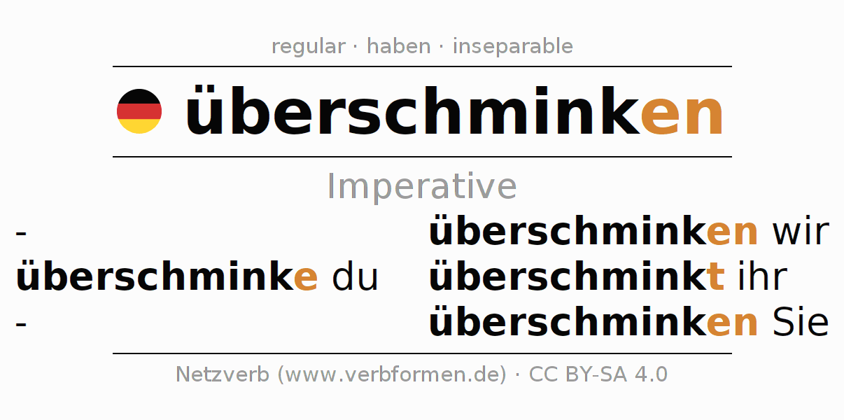 The conjugation of überschminken (reapply makeup, touch up) in the imperative is: überschminke (du), überschminken wir, überschminkt (ihr), überschminken Sie. The imperative is formed with the stem of present tense schmink. The endings -e, -en, -t, -en are appended to the stem. The personal pronoun is usually omitted in the 2nd person singular.The formation of the forms corresponds to the grammatical rules for the conjugation of the verbs in imperative. Comments ☆