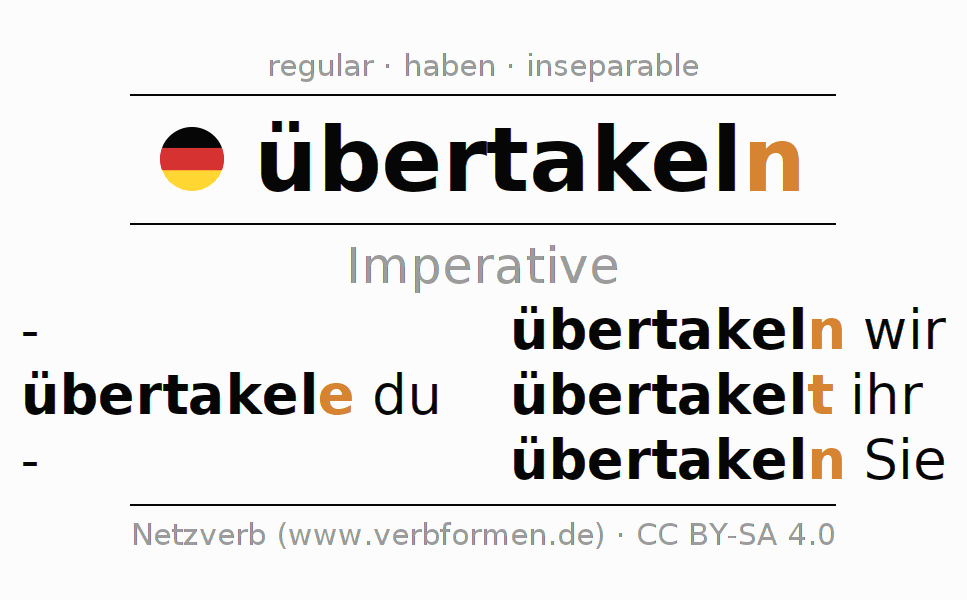 The conjugation of übertakeln (overcanvas) in the imperative is: übertak(e)le (du), übertakeln wir, übertakelt (ihr), übertakeln Sie. The imperative is formed with the stem of present tense takel. The endings -e, -n, -t, -n are appended to the stem. The endings in the 1st and 3rd person plural are shortened by e, since the verb ends with -ern. The personal pronoun is usually omitted in the 2nd person singular.The formation of the forms corresponds to the grammatical rules for the conjugation of the verbs in imperative. Comments ☆