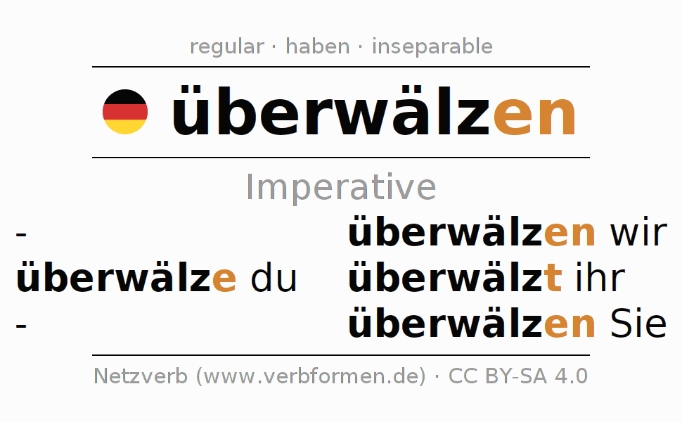 The conjugation of überwälzen (shift, pass on) in the imperative is: überwälze (du), überwälzen wir, überwälzt (ihr), überwälzen Sie. The imperative is formed with the stem of present tense wälz. The endings -e, -en, -t, -en are appended to the stem. The personal pronoun is usually omitted in the 2nd person singular.The formation of the forms corresponds to the grammatical rules for the conjugation of the verbs in imperative. Comments ☆