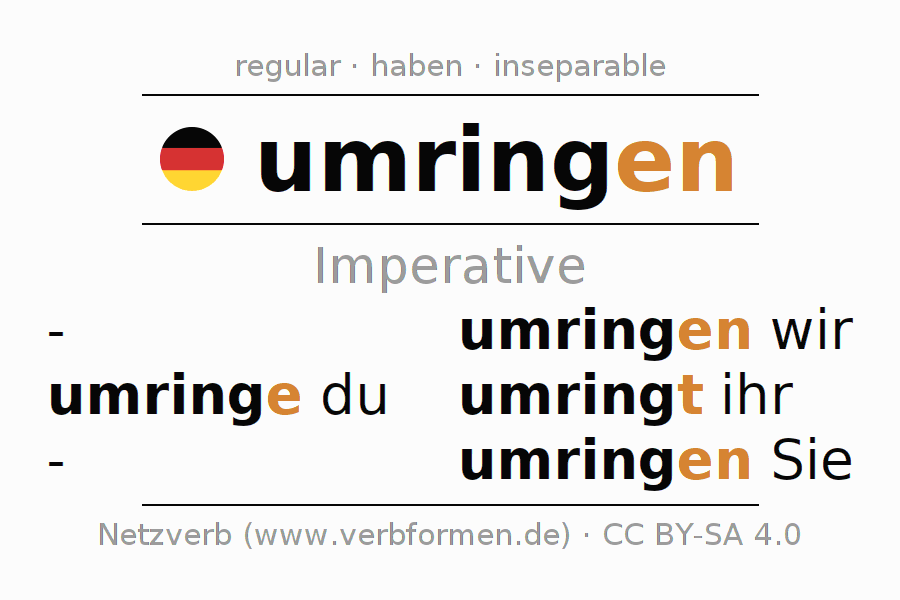 The conjugation of umringen (encircle, surround) in the imperative is: umringe (du), umringen wir, umringt (ihr), umringen Sie. The imperative is formed with the stem of present tense ring. The endings -e, -en, -t, -en are appended to the stem. The personal pronoun is usually omitted in the 2nd person singular.The formation of the forms corresponds to the grammatical rules for the conjugation of the verbs in imperative. Comments ☆