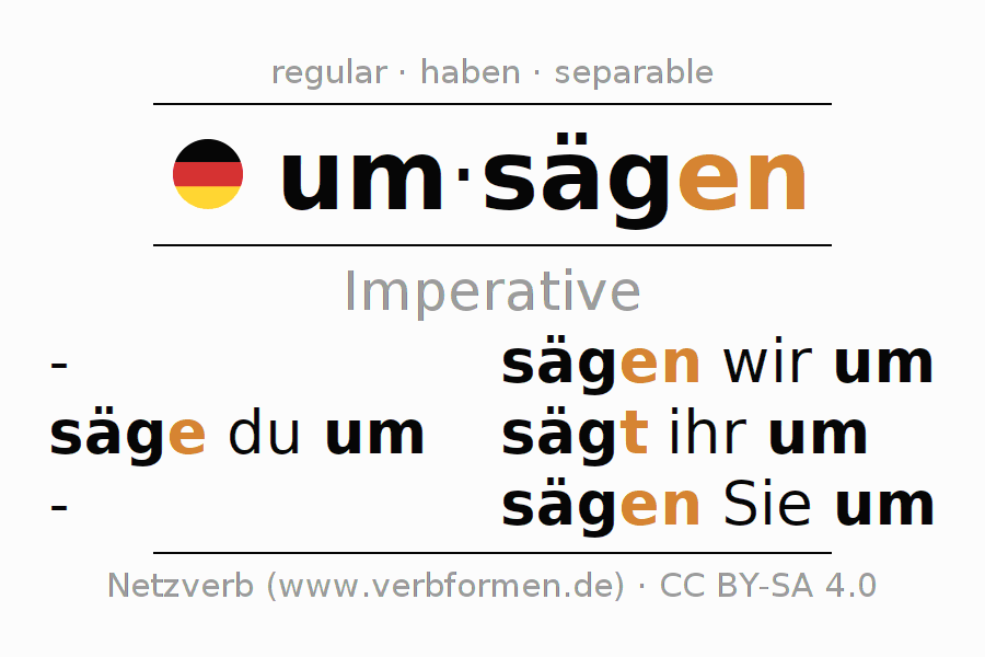 The conjugation of umsägen (fell, gun down) in the imperative is: säge (du) um, sägen wir um, sägt (ihr) um, sägen Sie um. The imperative is formed with the stem of present tense säg. The endings -e, -en, -t, -en are appended to the stem. The prefix um- of umsägen is separated.The personal pronoun is usually omitted in the 2nd person singular.The formation of the forms corresponds to the grammatical rules for the conjugation of the verbs in imperative. Comments ☆
