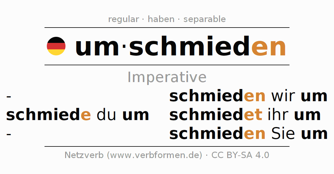 The conjugation of umschmieden (reforge, reshape) in the imperative is: schmiede (du) um, schmieden wir um, schmiedet (ihr) um, schmieden Sie um. The imperative is formed with the stem of present tense schmied. The endings -e, -en, -et, -en are appended to the stem. The ending of the 2nd Person Singular is extended by an e, as the stem ends in d. The prefix um- of umschmieden is separated.The personal pronoun is usually omitted in the 2nd person singular.The formation of the forms corresponds to the grammatical rules for the conjugation of the verbs in imperative. Comments ☆