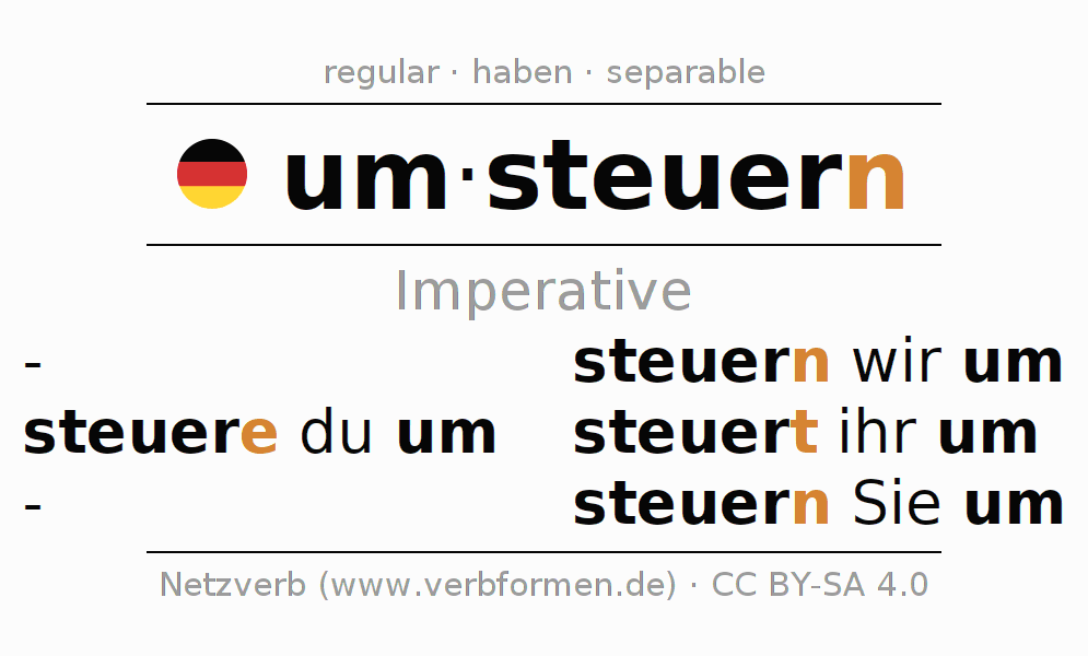The conjugation of umsteuern (change course, redirect) in the imperative is: steu(e)re (du) um, steuern wir um, steuert (ihr) um, steuern Sie um. The imperative is formed with the stem of present tense steuer. The endings -e, -n, -t, -n are appended to the stem. The endings in the 1st and 3rd person plural are shortened by e, since the verb ends with -ern. The prefix um- of umsteuern is separated.The personal pronoun is usually omitted in the 2nd person singular.The formation of the forms corresponds to the grammatical rules for the conjugation of the verbs in imperative. Comments ☆