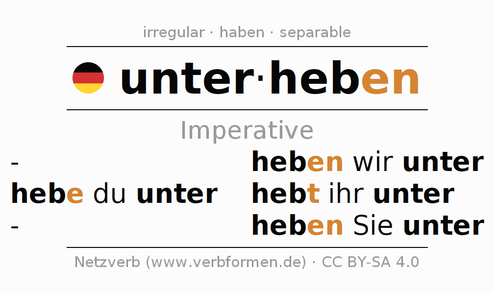 The conjugation of unterheben (fold in) in the imperative is: hebe (du) unter, heben wir unter, hebt (ihr) unter, heben Sie unter. The imperative is formed with the stem of present tense heb. The endings -e, -en, -t, -en are appended to the stem. The prefix unter- of unterheben is separated.The personal pronoun is usually omitted in the 2nd person singular.The formation of the forms corresponds to the grammatical rules for the conjugation of the verbs in imperative. Comments ☆
