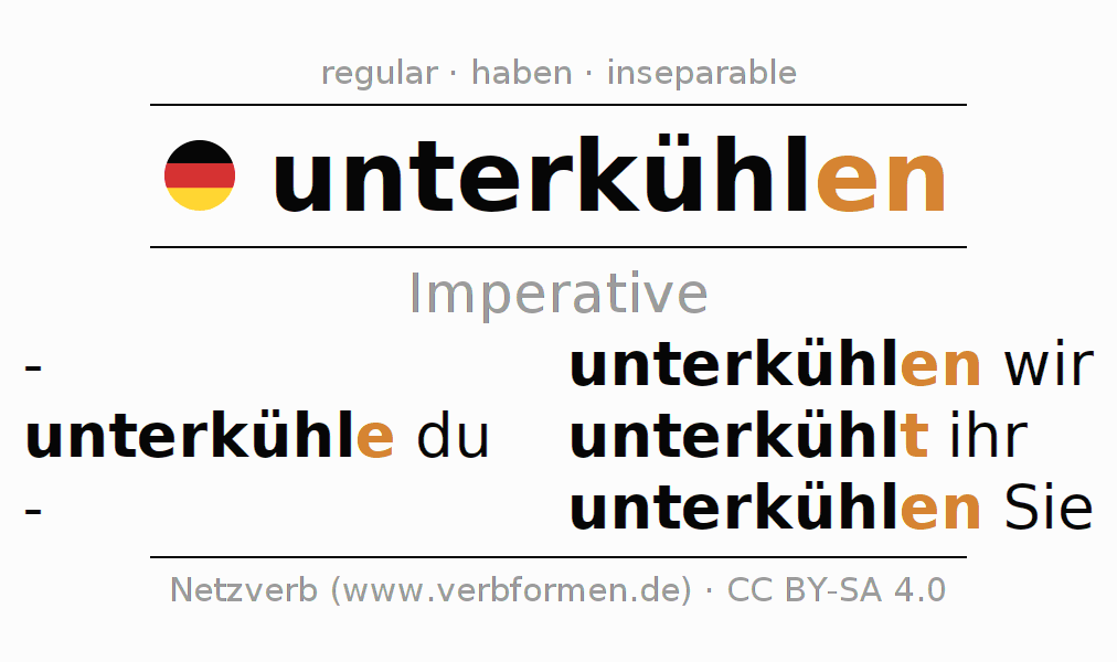 The conjugation of unterkühlen (supercool, become hypothermic) in the imperative is: unterkühle (du), unterkühlen wir, unterkühlt (ihr), unterkühlen Sie. The imperative is formed with the stem of present tense kühl. The endings -e, -en, -t, -en are appended to the stem. The personal pronoun is usually omitted in the 2nd person singular.The formation of the forms corresponds to the grammatical rules for the conjugation of the verbs in imperative. Comments ☆