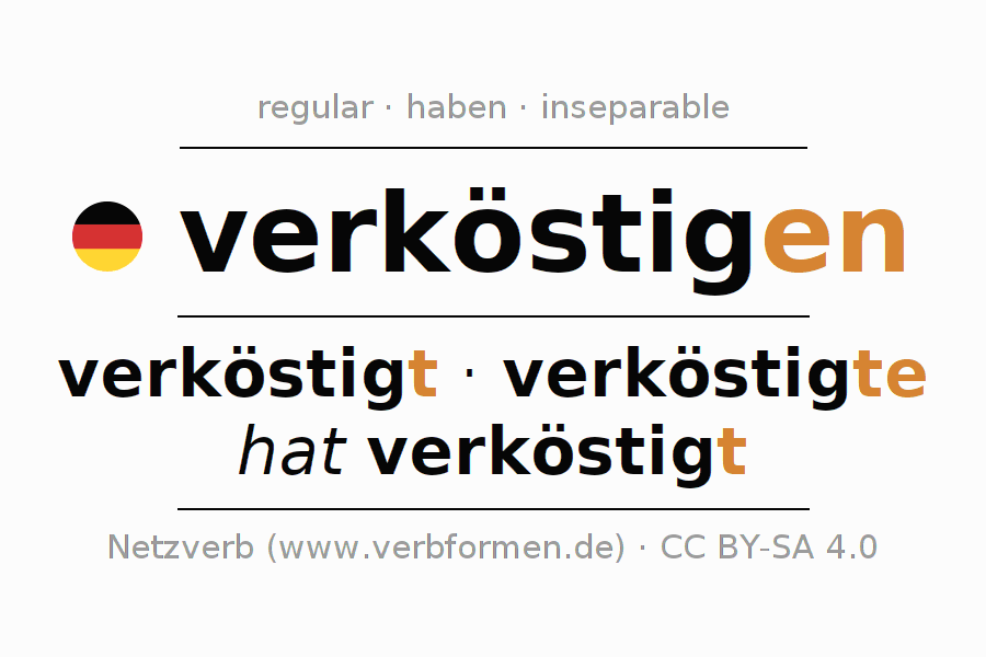 The conjugation of verköstigen (feed, entertain) in the imperative is: verköstige (du), verköstigen wir, verköstigt (ihr), verköstigen Sie. The imperative is formed with the stem of present tense köstig. The endings -e, -en, -t, -en are appended to the stem. The personal pronoun is usually omitted in the 2nd person singular.The formation of the forms corresponds to the grammatical rules for the conjugation of the verbs in imperative. Comments ☆